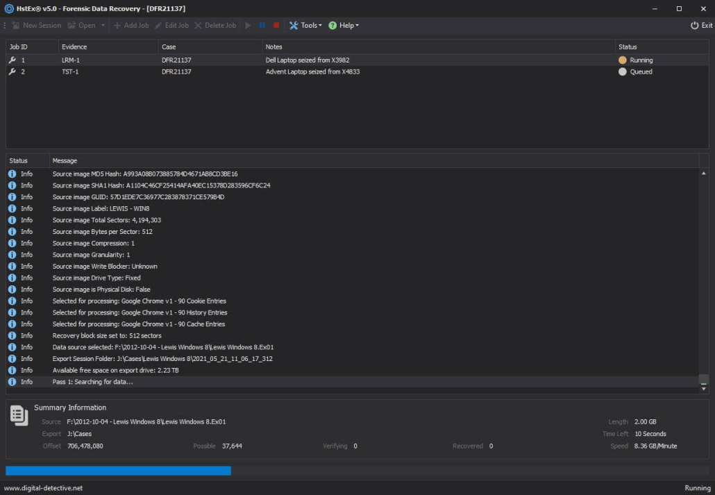 HstEx® is a fundamental and indispensable application which is included as part of the NetAnalysis® suite. It is an advanced data recovery tool and is designed to recover deleted web browser artefacts from a wide-variety of forensic sources such as evidence files (e01, ex01, dd, etc.) and dump files from mobile extraction tools.
